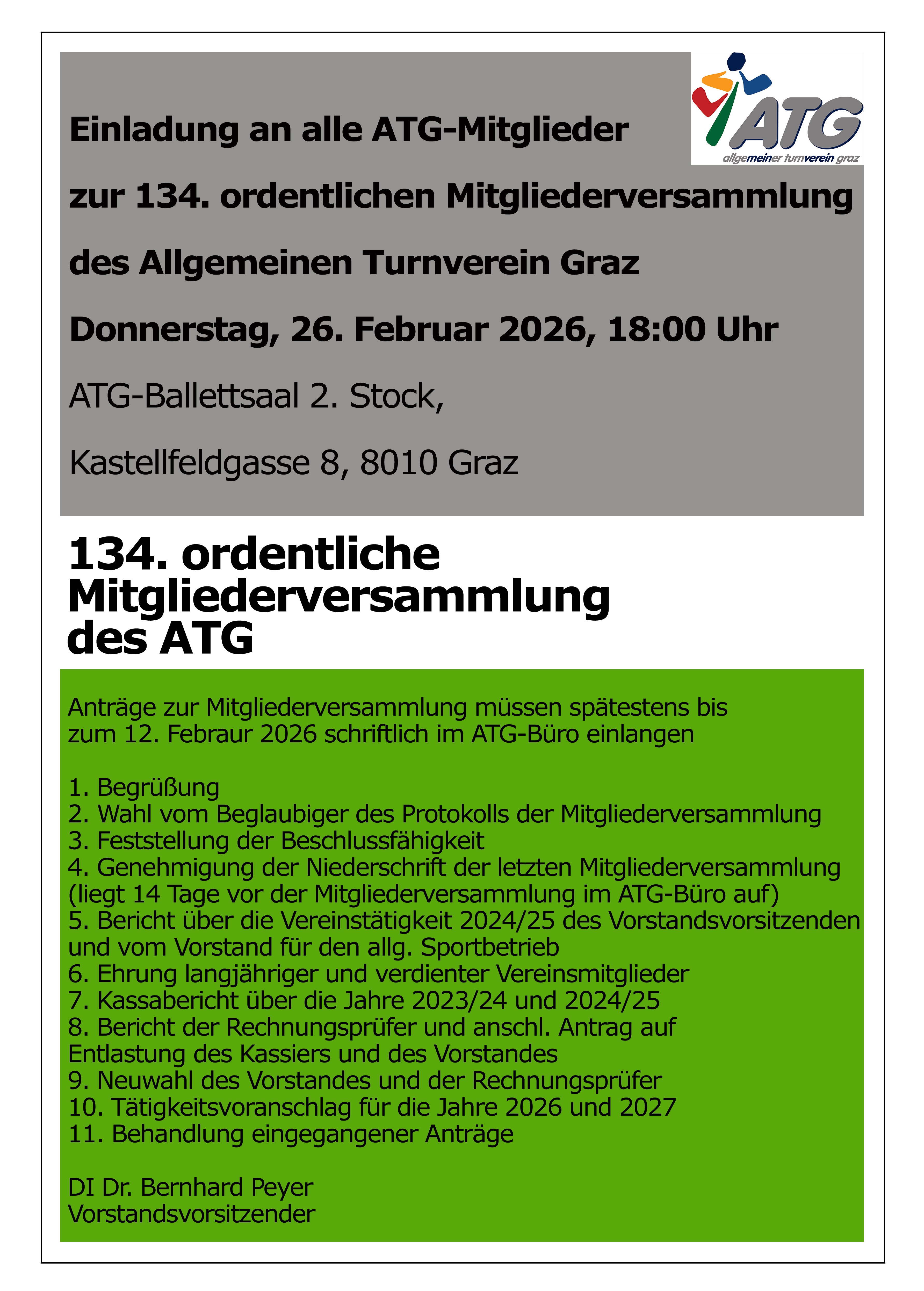 Einladung an alle ATG-Mitglieder zur 134. Ordentlichen Mitgliederversammlung des Allgemeinen Turnverein Graz